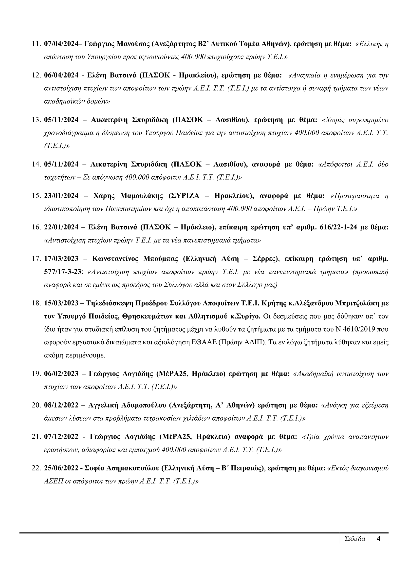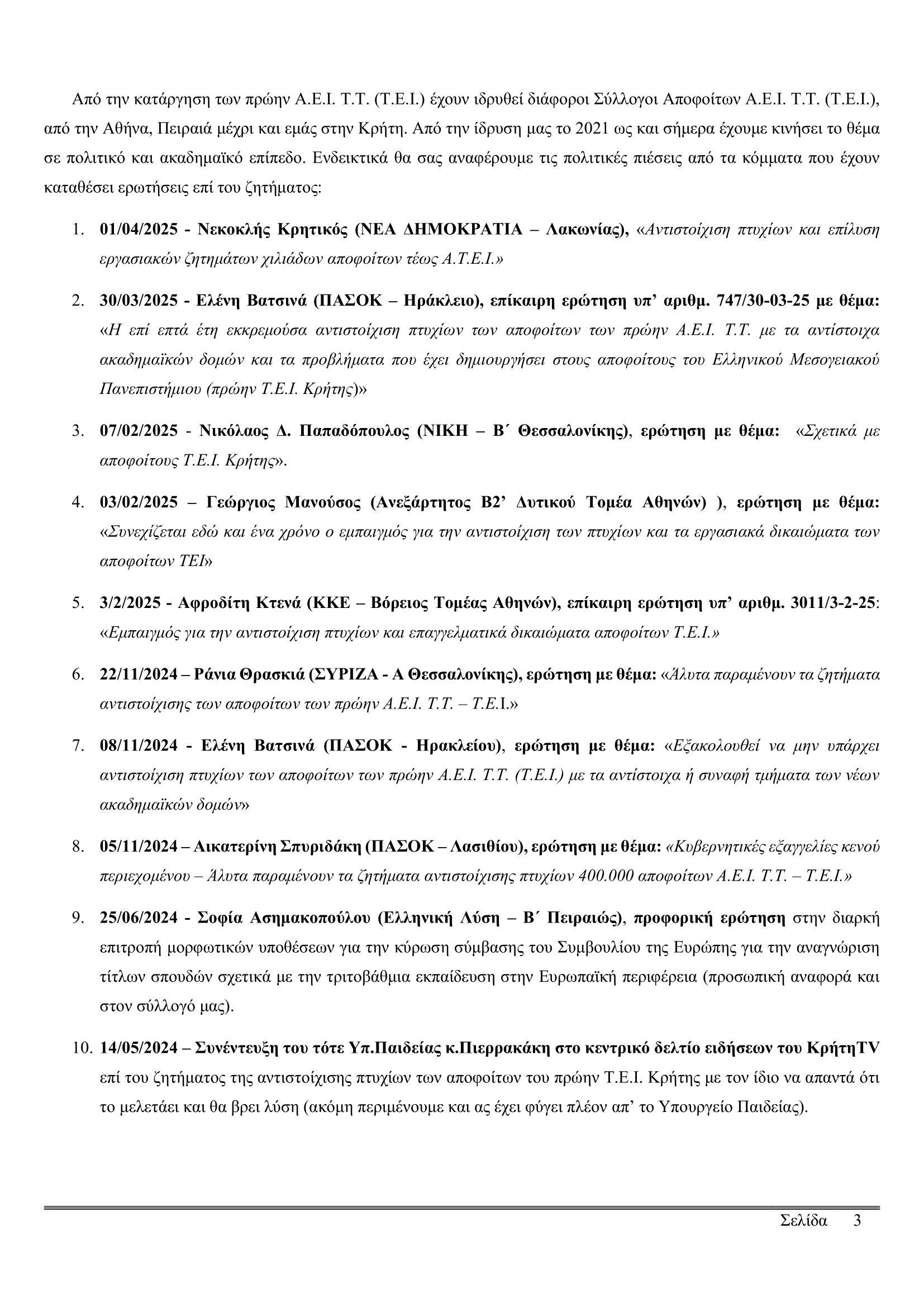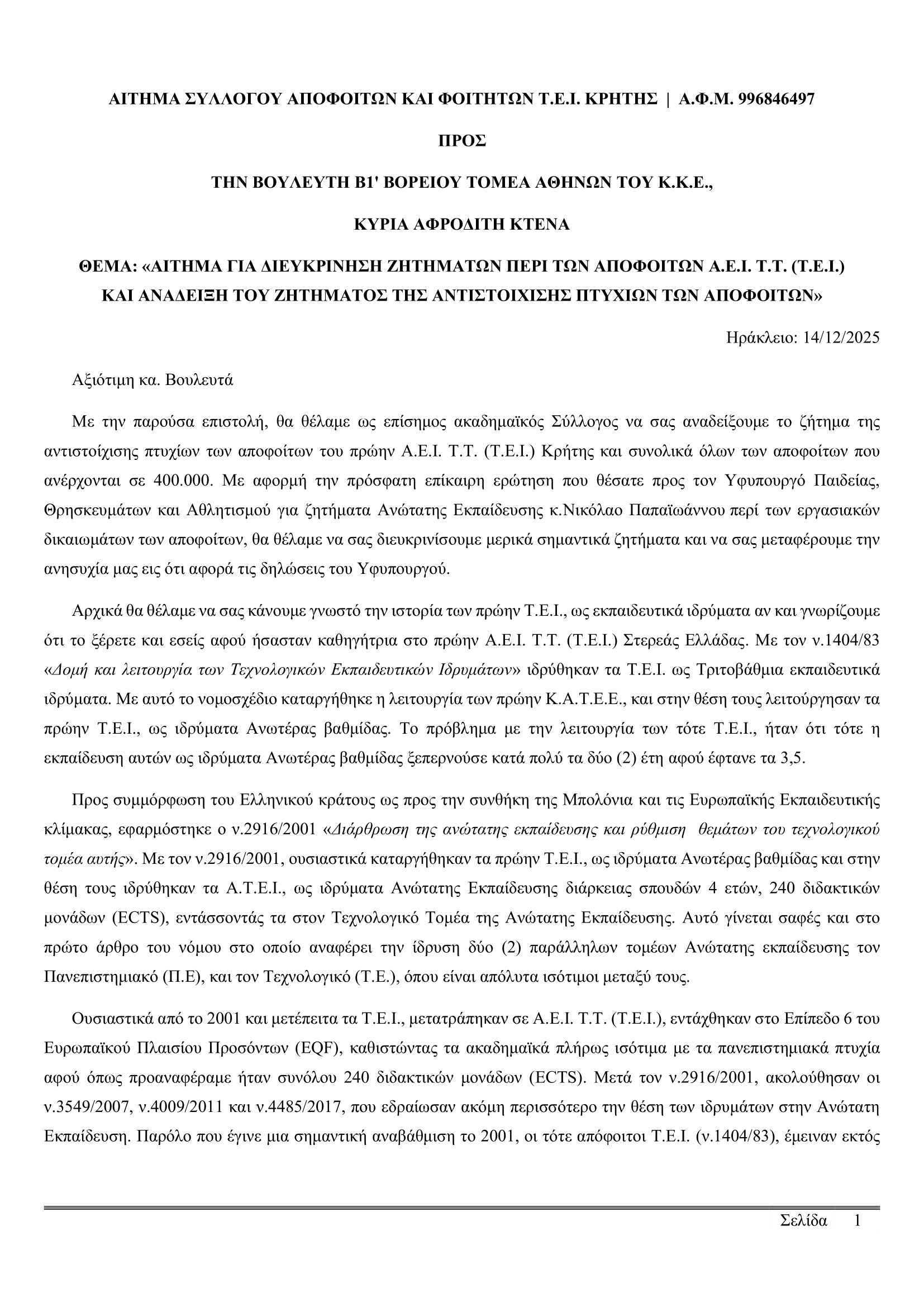 Αίτημα συνάντησης Συλλόγου Αποφοίτων και Φοιτητών Τ.Ε.Ι. Κρήτης προς την Βουλευτή ΚΚΕ Α.Κτενά