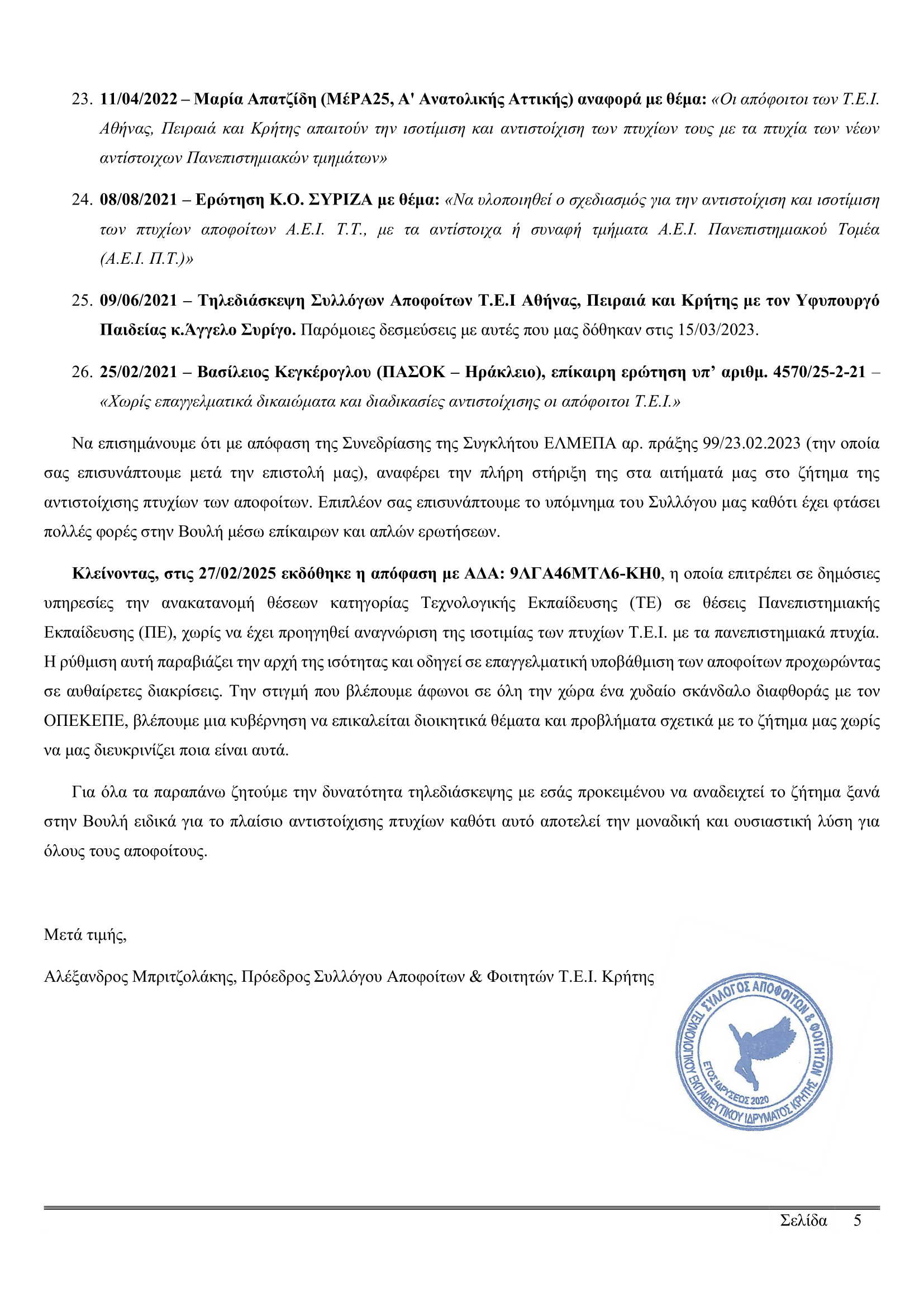 Αίτημα για τηλεδιάσκεψη έστειλε ο Σύλλογος Αποφοίτων & Φοιτητών Τ.Ε.Ι. Κρήτης προς τη Βουλευτή Β1’ Βορείου Τομέα Αθηνών του ΚΚΕ, κα. Αφροδίτη Κτενά, με αίτημα την ανάδειξη στη Βουλή του ζητήματος της αντιστοίχισης των πτυχίων των αποφοίτων των πρώην Τ.Ε.Ι..