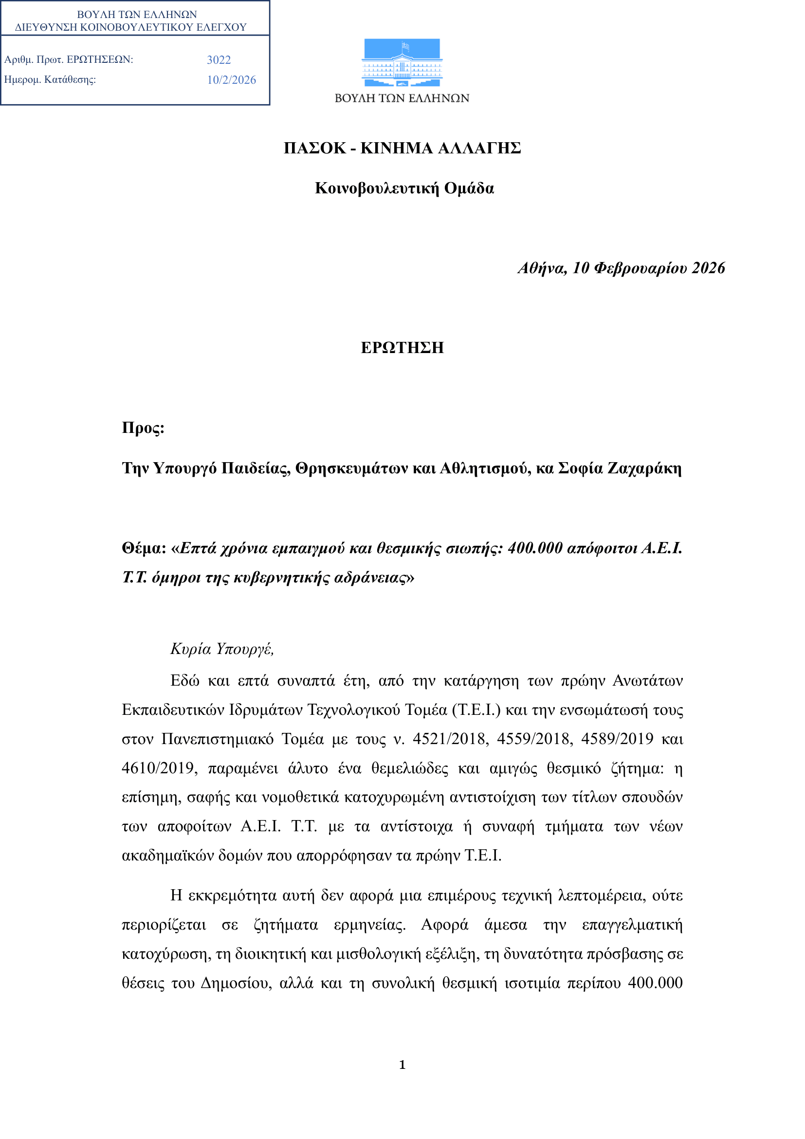 Έπειτα από το διασυλλογικό Δελτίο Τύπου που κοινοποιήσαμε οι Σύλλογοι Αποφοίτων και Φοιτητών ΤΕΙ Κρήτης και Αποφοίτων ΤΕΙ Αθήνας και ΑΕΙ Πειραιά Τ.Τ., στις 30/01/2026 προς τα Μέσα Μαζικής Ενημέρωσης και τους Βουλευτές του Ελληνικού Κοινοβουλίου, η Βουλευτής ΠΑΣΟΚ Νομού Λασιθίου, κα. Κατερίνα Σπυριδάκη, επανέρχεται με νέα Ερώτηση προς την Υπουργό Παιδείας, Θρησκευμάτων και Αθλητισμού, κα. Σοφία Ζαχαράκη, σχετικά με το ζήτημα της αντιστοίχισης των πτυχίων των αποφοίτων Α.Ε.Ι. Τ.Τ. (ΤΕΙ).