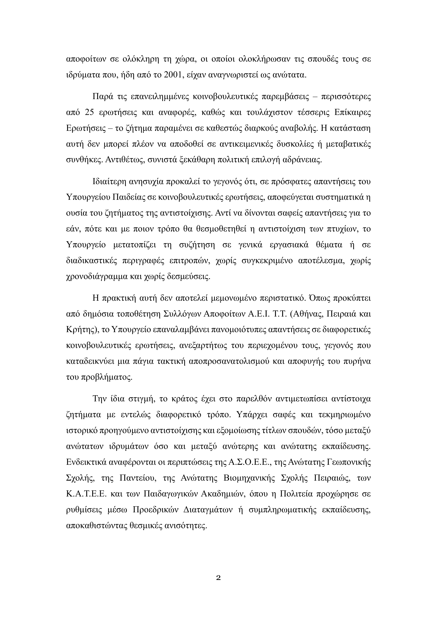 - καθώς και με τη συνολική θεσμική ισοτιμία περίπου 400.000 πτυχιούχων, οι οποίοι ολοκλήρωσαν τις σπουδές τους σε ιδρύματα που, ήδη από το 2001, είχαν αναγνωριστεί ως Ανώτατα Εκπαιδευτικά Ιδρύματα.