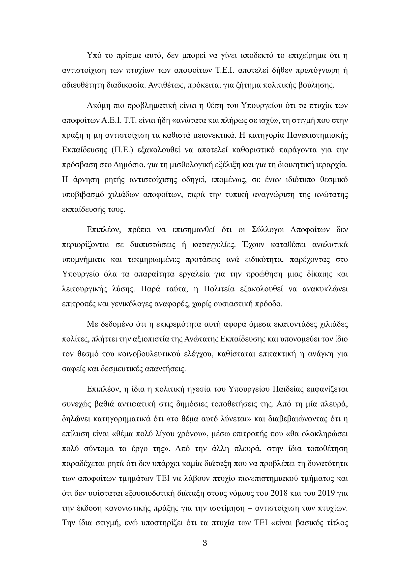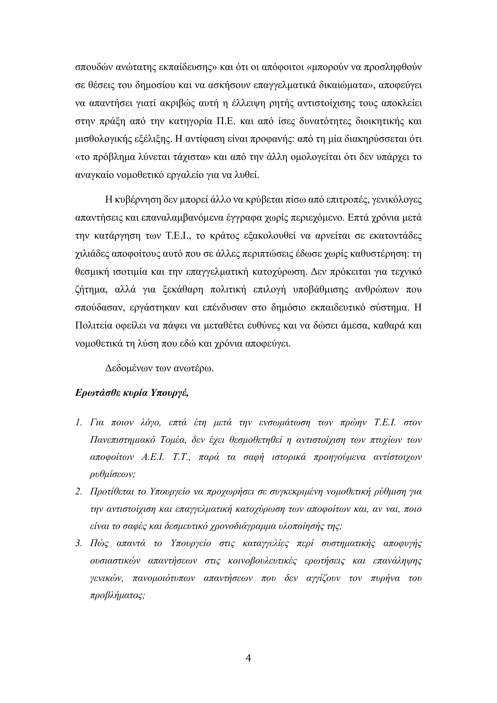 Για ποιον λόγο, επτά έτη μετά την ενσωμάτωση των πρώην Τ.Ε.Ι. στον Πανεπιστημιακό Τομέα, δεν έχει ακόμη θεσμοθετηθεί η αντιστοίχιση των πτυχίων των αποφοίτων Α.Ε.Ι. Τ.Τ., παρά την ύπαρξη σαφών ιστορικών προηγούμενων αντίστοιχων ρυθμίσεων;