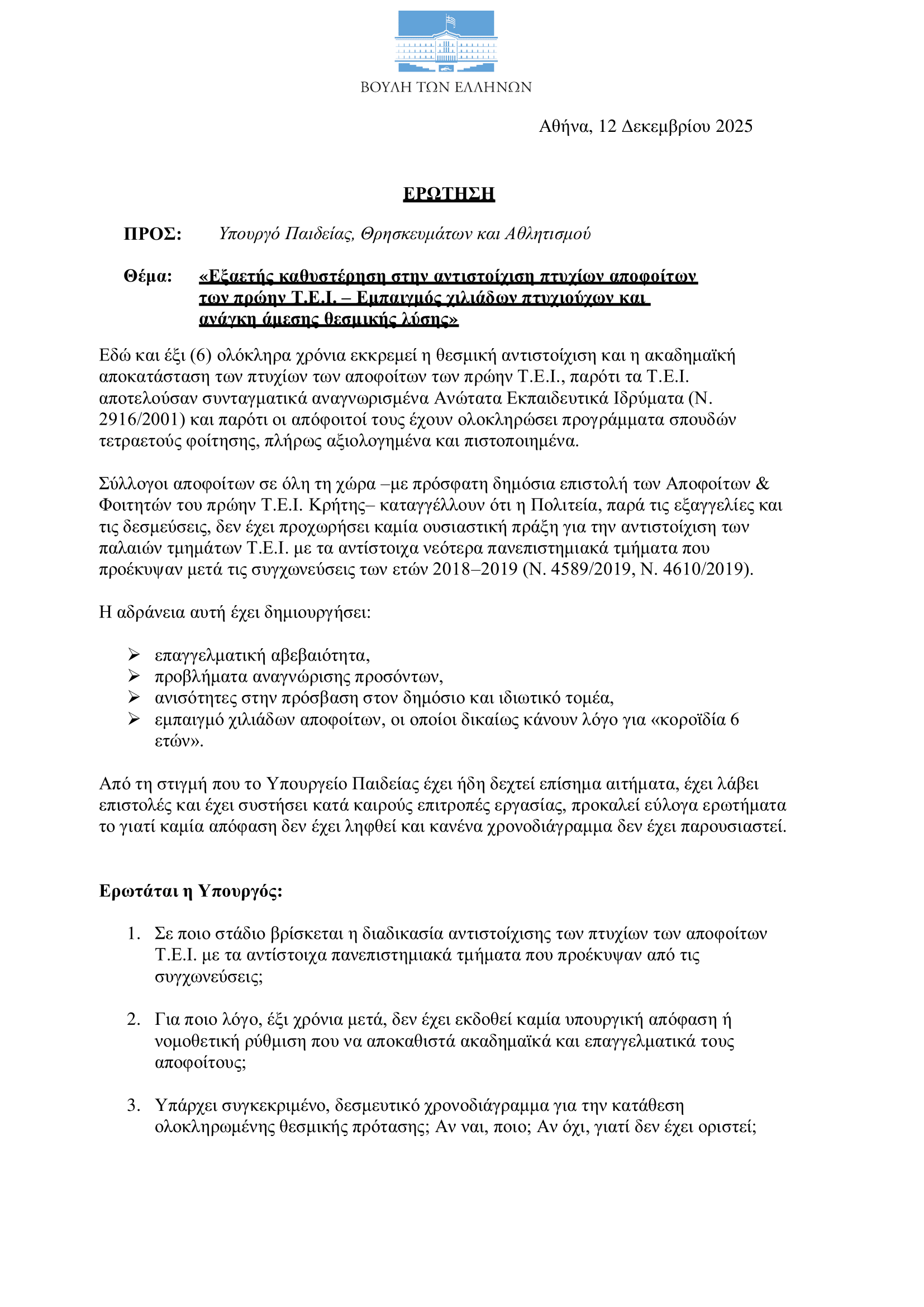 Ερώτηση προς την Υπουργό Παιδείας, Θρησκευμάτων και Αθλητισμού, κυρία Σοφία Ζαχαράκη, κατέθεσε χτές, 12 Δεκεμβρίου 2025, ο ανεξάρτητος βουλευτής Β2 Δυτικού Τομέα Αθηνών, Γεώργιος Μανούσος, αναδεικνύοντας το χρόνιο ζήτημα της θεσμικής αντιστοίχισης των πτυχίων των αποφοίτων των πρώην Τεχνολογικών Εκπαιδευτικών Ιδρυμάτων (Τ.Ε.Ι.).