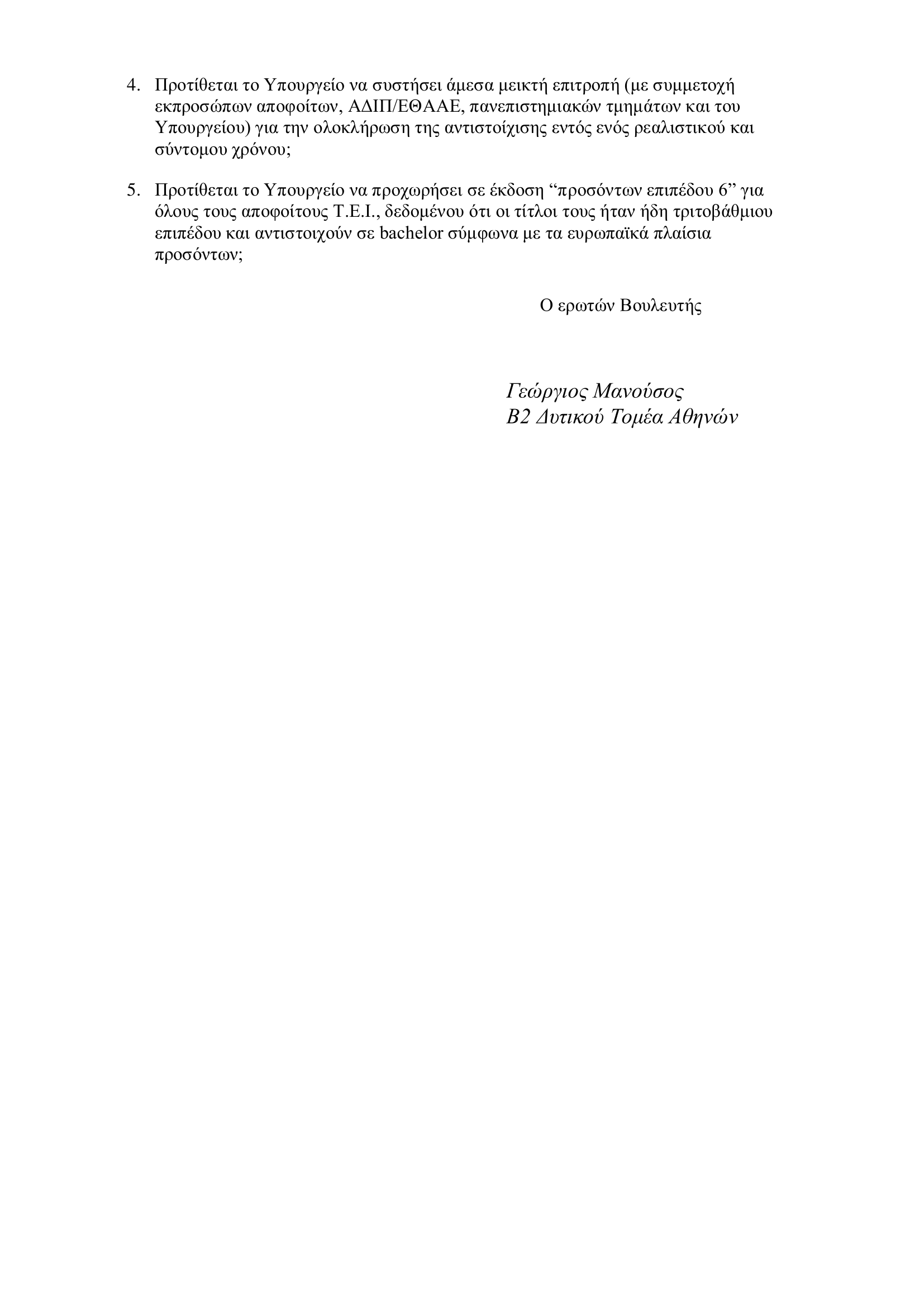 Ερώτηση του Βουλευτή Γιώργου Μανούσου προς την Υπ.Παιδείας για το ζήτημα της αντιστοίχισης πτυχίων αποφοίτων Α.Ε.Ι. Τ.Τ. (Τ.Ε.Ι.)