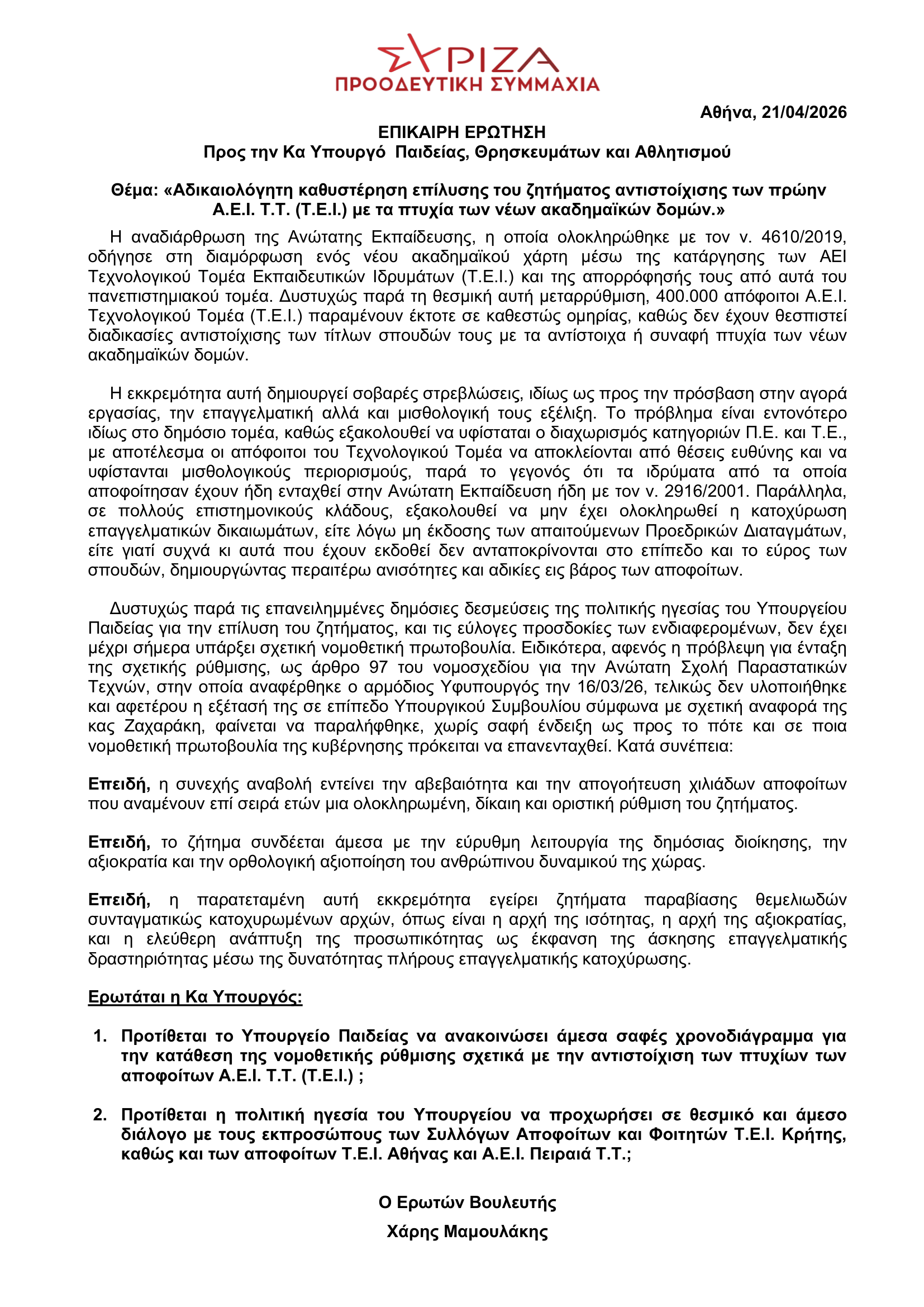 Την άμεση επίλυση του χρόνιου ζητήματος της αντιστοίχισης των πτυχίων των αποφοίτων των πρώην Α.Ε.Ι. Τεχνολογικού Τομέα (Τ.Ε.Ι.) με τα αντίστοιχα ή συναφή πτυχία των νέων ακαδημαϊκών δομών, φέρνει στη Βουλή με Επίκαιρη Ερώτηση προς την Υπουργό Παιδείας, Θρησκευμάτων και Αθλητισμού ο Βουλευτής ΣΥΡΙΖΑ – Π.Σ. νομού Ηρακλείου κ.Χάρης Μαμουλάκης.